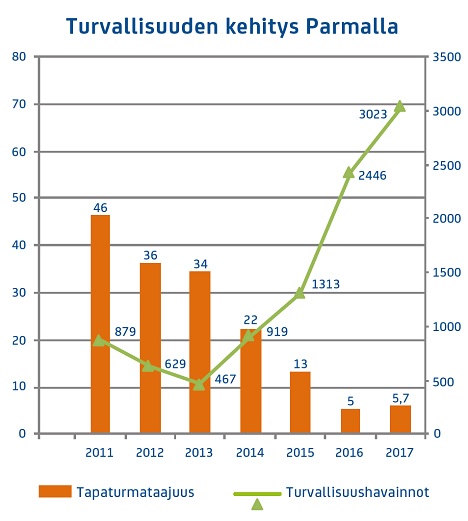 Parma aloitti johdonmukaiset toimenpiteet työturvallisuuden parantamiseksi jo yli kymmenen vuotta sitten. Tapaturmataajuutta kuvaava suhdeluku on pudonnut murto-osaan lähtötasosta. Viime vuonna yhtiön tapaturmataajuutta kuvaava suhdeluku oli 5,7 kpl miljoonaa työtuntia kohden.